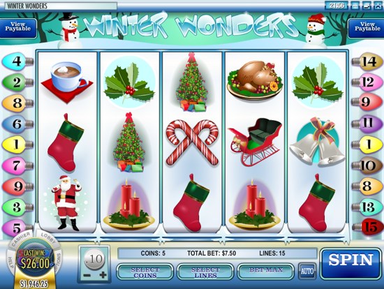 Winter Wonders is a 5 reel, 15 payline slot machine. The slot has a Scatter Icon, Free Spins bonus round and one Wild Icon.