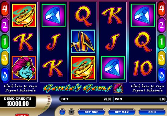 Genie's Gems is a popular 5 reel, 5 pay line video slot with animated symbold and 29 winning combinations. Hit 5 Genie symbols to win top 10,000-coin jackpot, or hit 5 Genies Gems to win 5,000 coins..