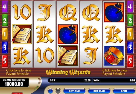 Winning Wizards is a 5-reel, 5-payline video slot game. The Wizard offers great theme, magical sound and 31 winning combinations. Hit 3 or more Wizard's staffs, spell books, pouches of magic potion..